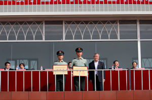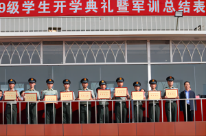 开学典礼在庄严的国歌声中拉开了帷幕,鲜红的五星红旗徐徐升起。随后,校长助理、学生处处长高洪震宣读了军训获奖名单;主席台上就座的各位领导为依次走上台前的教官和学生代表颁发了荣誉证书,并合影留念。