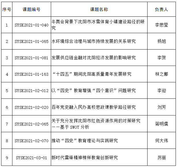 近日,沈阳市社会科学界联合会发布了《关于公布2021年度社会科学课题立项名单的通知》(沈社科联发[2021]19号)文件,经个人申报、学校推荐、市社科联组织专家评审和面向社会公示,我校9位老师申报的课题成功立项。