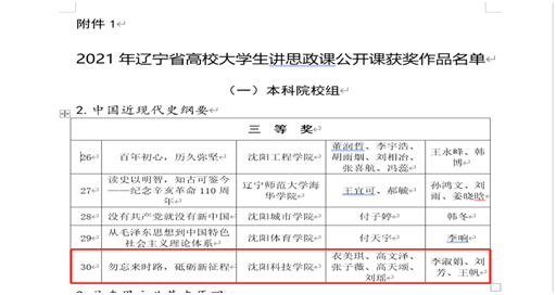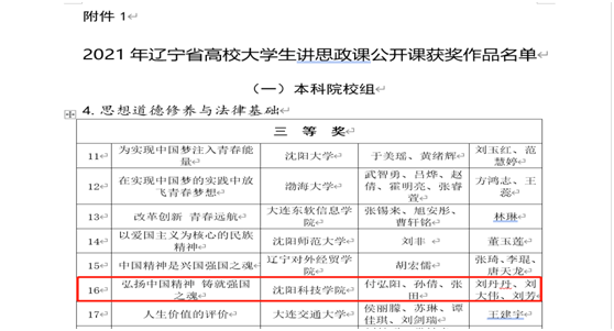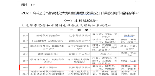 在2021年辽宁省高校大学生讲思政课公开课比赛中,郭辰来等同学的课程《共筑中国梦》(指导教师郭书瑜、刘芳、李淑娟)荣获本科院校组《毛泽东思想和中国特色社会主义理论体系概论》三等奖。衣美琪等同学的课程《勿忘来时路,砥砺新征程》(指导教师李淑娟、刘芳、王帆)的课程荣获本科院校组《中国近现代史纲要》三等奖。付弘阳等同学的作品《弘扬中国精神,铸就强国之魂》(指导教师刘丹丹、刘大伟、刘芳)的课程荣获本科院校组《思想道德修养与法律基础》三等奖。
