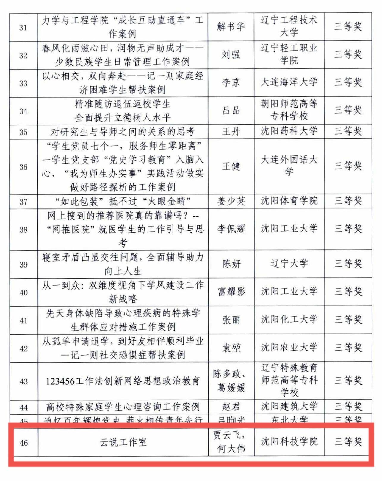 近日,辽宁省教育厅公布了2021年度辽宁省高校辅导员优秀工作案例和优秀论文评选结果,经个人申报、学校推荐、专家评审、结果公示等环节,最终我校贾云飞、何大伟老师撰写的工作案例《云说工作室》荣获三等奖。并于1月24日参加了辽宁省高校辅导员科研素质能力提升工作线上活动。