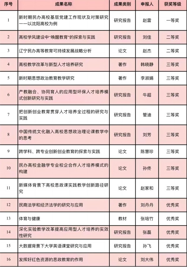 近日,辽宁省民办教育协会公布了《关于发布辽宁省民办教育协会第一届教育科学研究优秀成果评选结果的通知》(辽民教协发[2022]2号)文件,经学校遴选推荐、协会学术委员会专家评审和公示,我校16项成果成功获奖,其中一等奖1项、二等奖2项、三等奖8项、优秀奖5项。