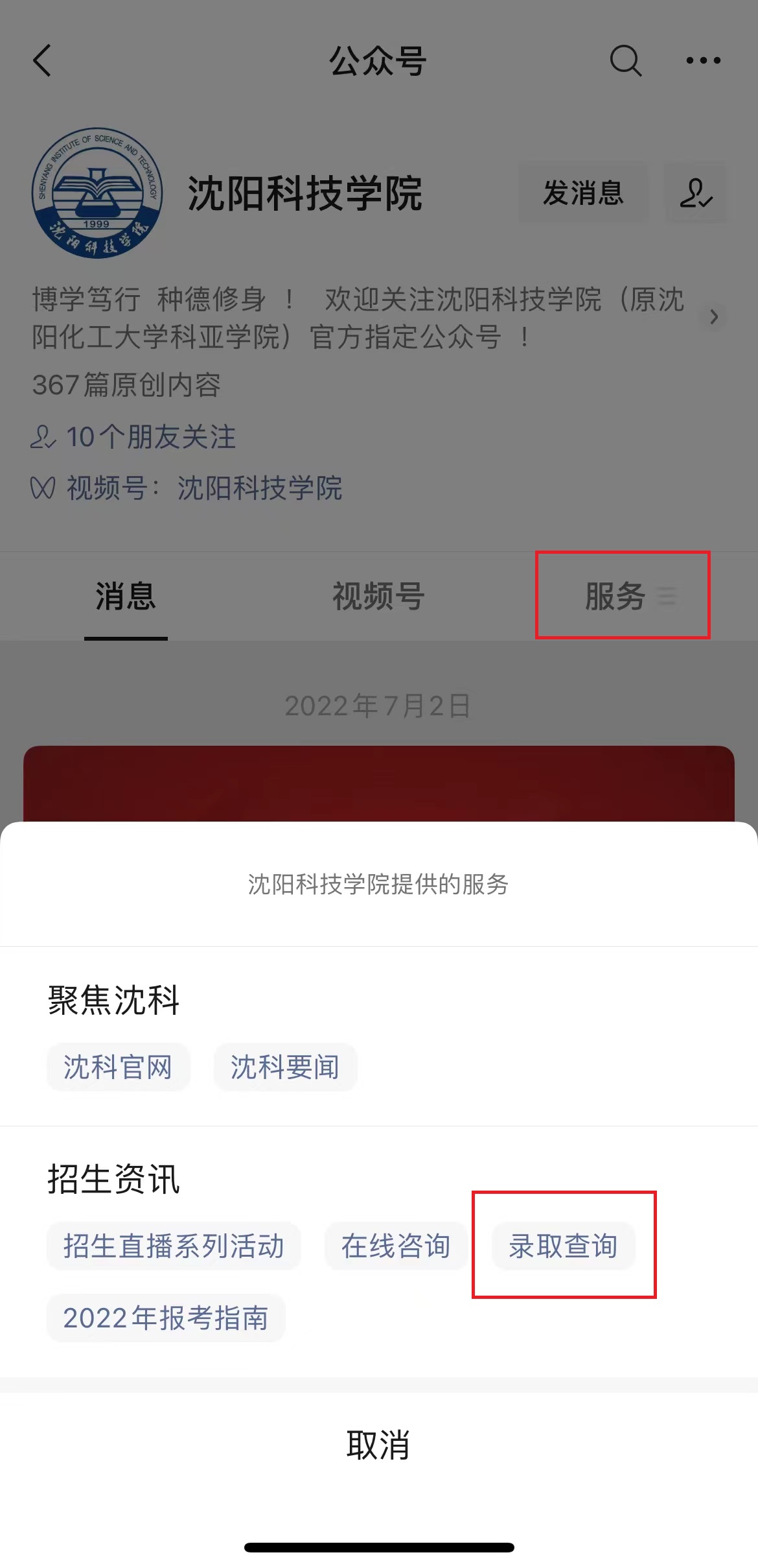 3、校园公众号:考生可搜索我校官方公众号“mk官方网站”进入我校官方微信平台,首页屏幕右下角点击“招生资讯”中的“录取查询”,进入查询页面,通过输入“姓名”和“考生号”即可查询录取结果。
