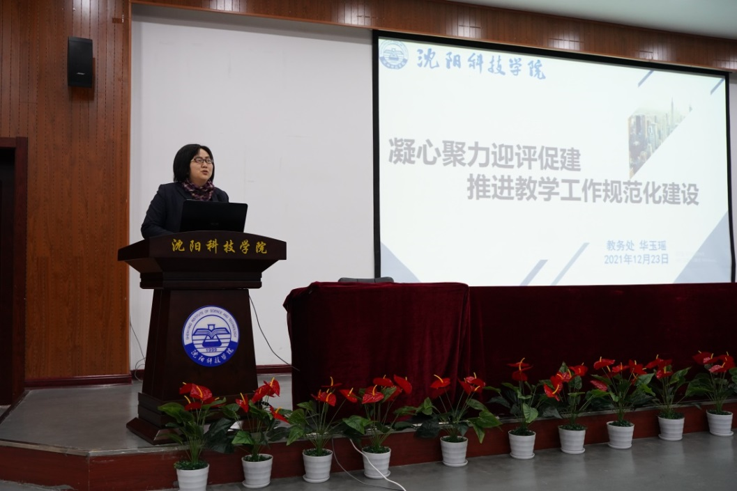 教务处处长华玉瑶作题为《凝心聚力,迎评促建——推进教学工作规范化建设》专题报告。华玉瑶处长从本科教学合格评估“二十字方针”与“三基本”出发,以本科教学合格评估指标体系与基本要求为标准,立足学校教学工作实际,分别介绍了“专业与课程建设”、“教学质量”两大一级评估指标基本要求,及其对应的国家和学校相关文件制度与工作要求;并从课堂教学规范的角度,详细说明了在教学工作中如何达到合格评估的基本要求。