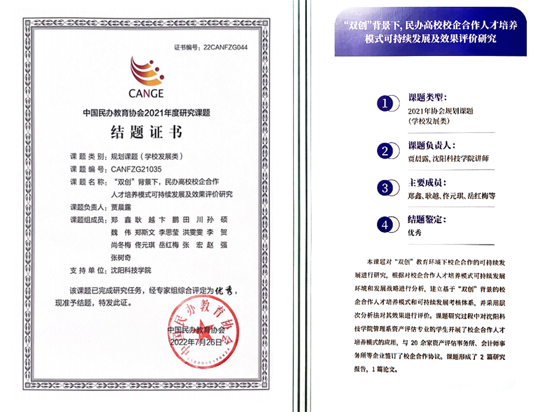 该课题对“双创”教育环境下校企合作的可持续发展进行研究,根据对校企合作人才培养模式可持续发展环境和发展战略进行分析,建立基于“双创”背景的校企合作人才培养模式和可持续发展考核体系,并采用层次分析法对其效果进行评价。课题研究过程中对mk官方网站管理与传媒系资产评估专业的学生开展了校企合作人才培养模式的应用,与 20 余家资产评估事务所、会计师事务所等企业签订了校企合作协议。课题形成了 2 篇研究报告,1篇论文。