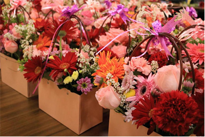 本次插花活动邀请专业花艺师进行授课指导。花艺师为同学们现场介绍鲜花知识,热情的太阳花、富贵的芍药、温情的康乃馨、烂漫的玫瑰、纯粹的小雏菊、清新的尤加利,这些朝气蓬勃的鲜花聚成了一股股热烈的气息。随后,花艺师在花材选择、色彩搭配、视觉形态、摆放位置上进行了详细的讲解,并为同学们演示插花步骤。