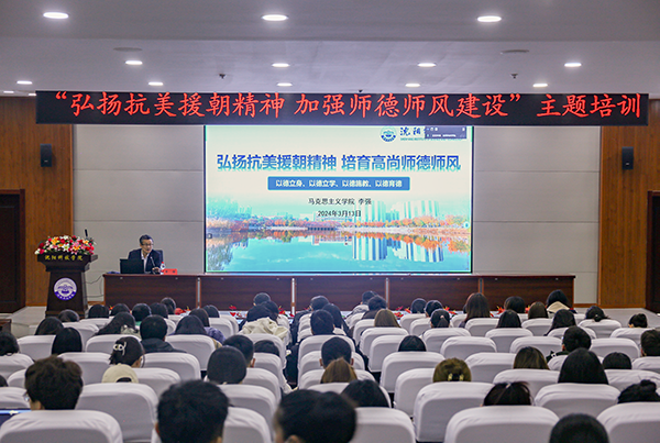 为进一步加强我校师德师风建设,全面提升教师思想政治素质、职业道德水平,建立健全师德师风建设长效机制,通过弘扬抗美援朝精神,激发教师的爱国情感和社会责任感,推动学校教育事业的发展,近日,“弘扬抗美援朝精神 加强师德师风建设”培训工作在图书馆报告厅如期举行。本次培训特别邀请到马克思主义学院李强教授,为全体教师带来一场主题为“弘扬抗美援朝精神,培育高尚师德师风”专题讲座。李强教授主要从师德的内容与结构特点、师德师风建设的重要意义、师德师风建设的具体要求及内容、违反师德师风的主要表现、以伟大抗美援朝精神为指引培育高尚师德师风等五个方面进行讲授。