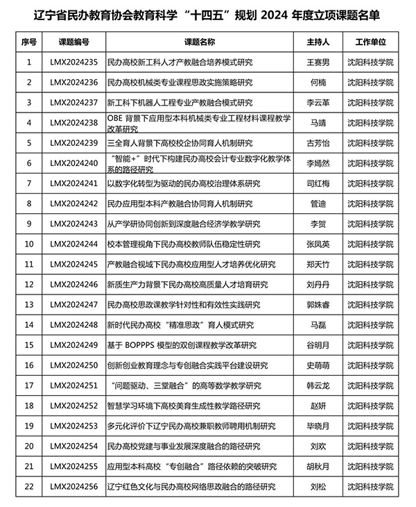 近日,辽宁省民办教育协会发布了《关于批准教育科学“十四五”规划2024年度立项课题的通知》(辽民教协发〔2024〕1号)。经本人申报、学校遴选推荐、专家评审等程序,我校成功获立课题22项!
