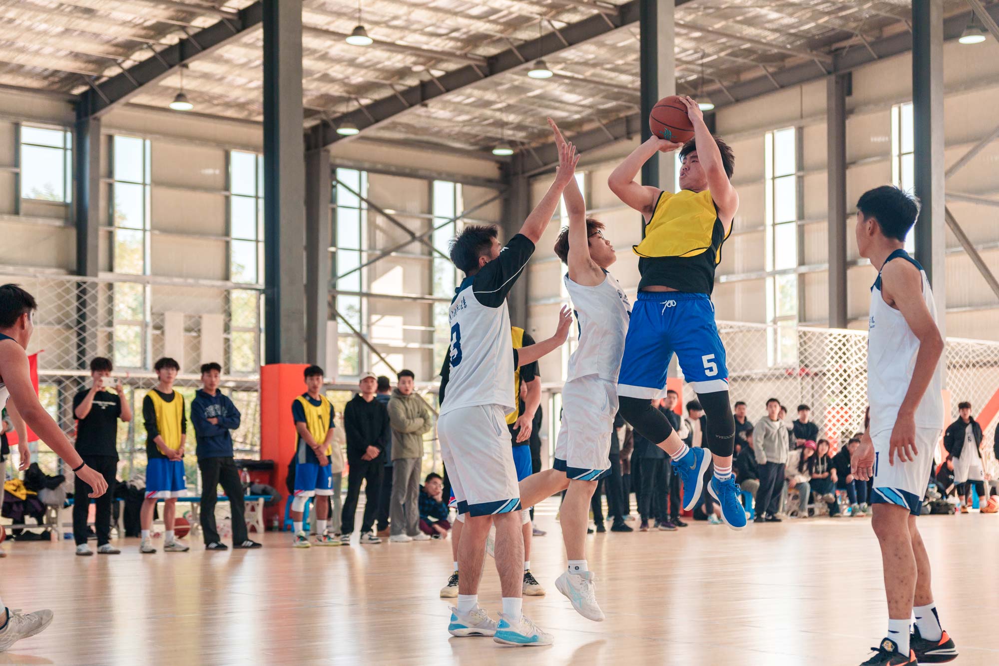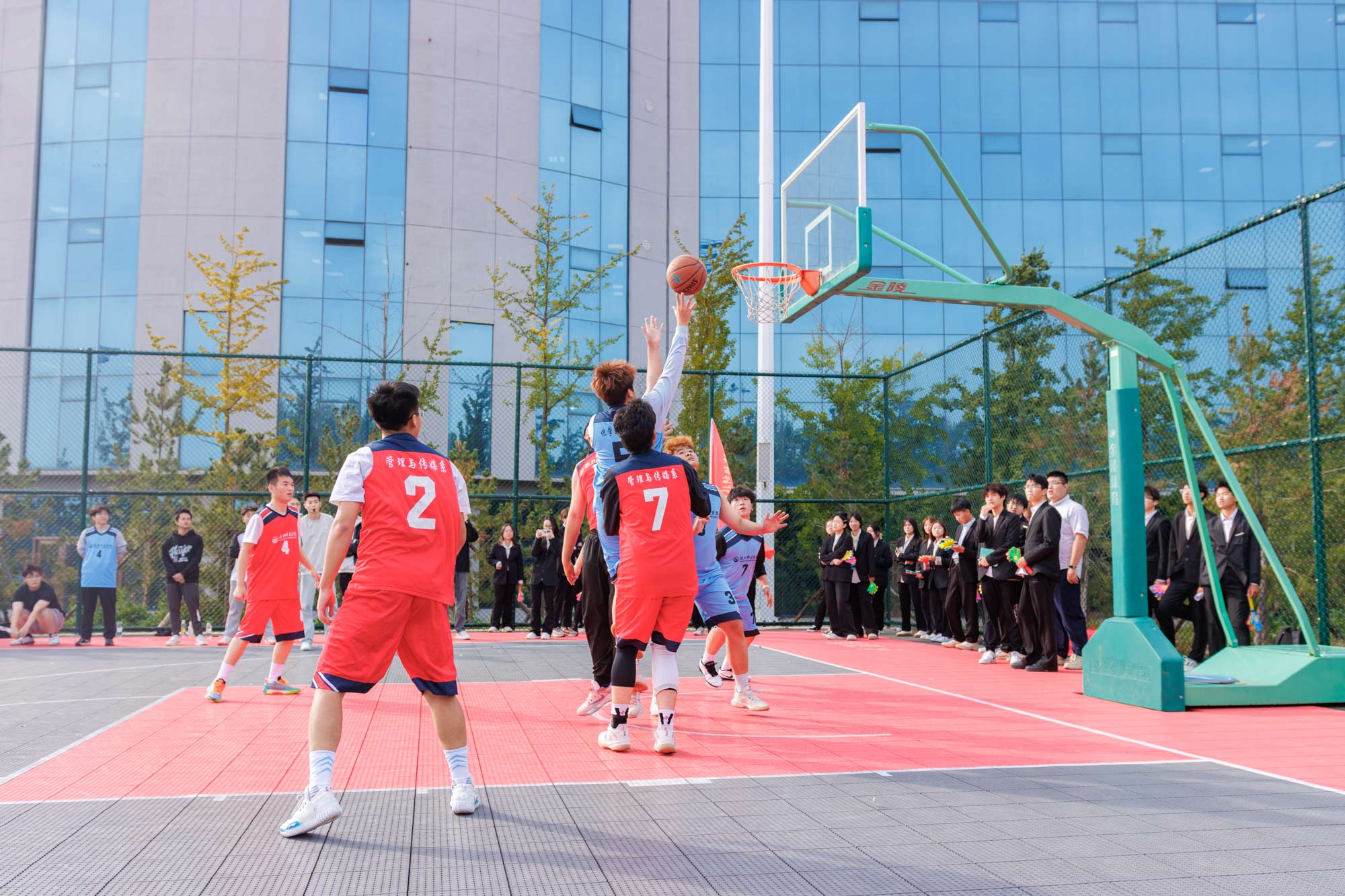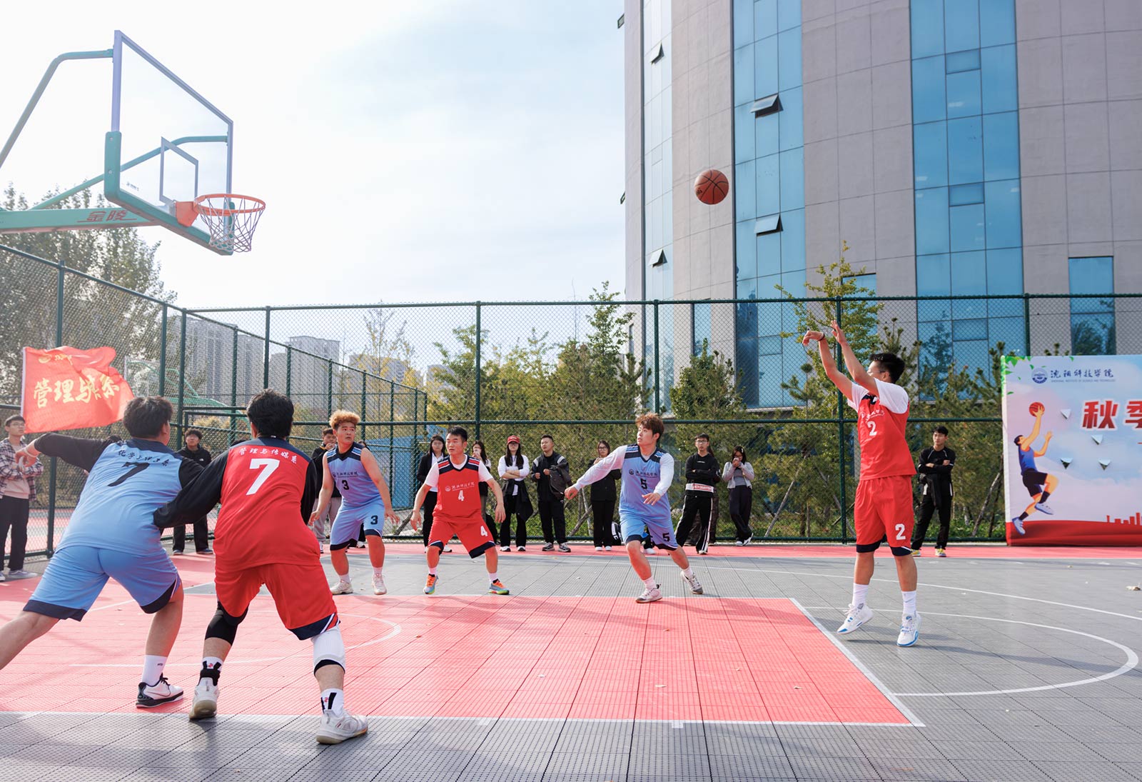 为庆祝新中国成立75周年,弘扬中华体育精神,丰富学生课余生活,展现新时代青年朝气蓬勃的精神风貌,近日,我校第三届“迎新杯”校园男子篮球赛在南校区篮球场震撼开幕。党委副书记、副校长高洪震莅临比赛现场,为篮球赛开球。我校7支队伍,共49名篮球健将参赛,历时8天的激烈角逐,参赛队员们迎“篮”而上,奋力拼搏,为观众呈现了一场场视觉与激情的双重盛宴。
