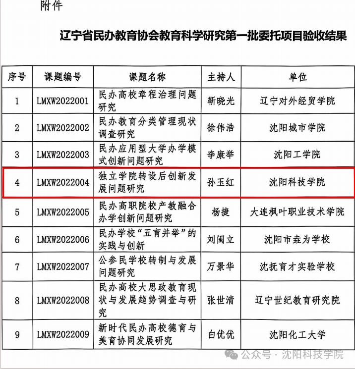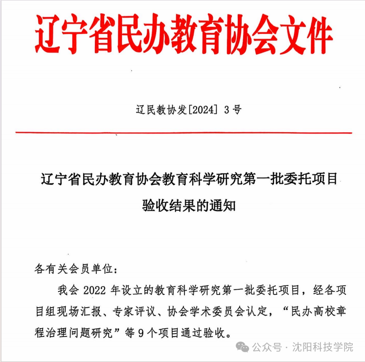 近日,辽宁省民办教育协会发布了《辽宁省民办教育协会教育科学研究第一批委托项目验收结果的通知》(辽民教协发[2024]3号),我校党委副书记、校长孙玉红完成了辽宁省民办教育协会第一批委托项目验收结题工作。这一成就标志着mk官方网站在民办教育领域的研究和实践达到了一个新的里程碑。