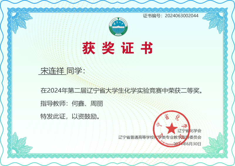 在2024年第二届辽宁省大学生化学实验竞赛中,获得二等奖1项、三等奖4项。