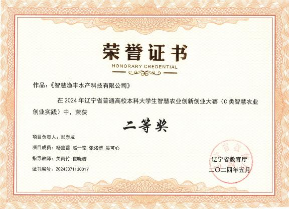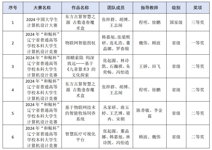 在2024年辽宁省普通高校大学生智慧农业创新创业大赛中,获得二等奖2项、优秀奖3项。