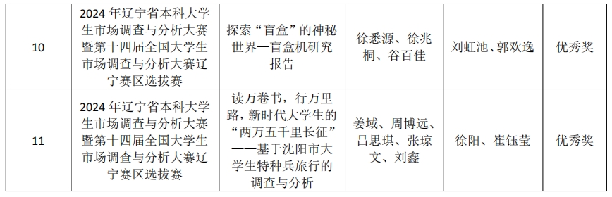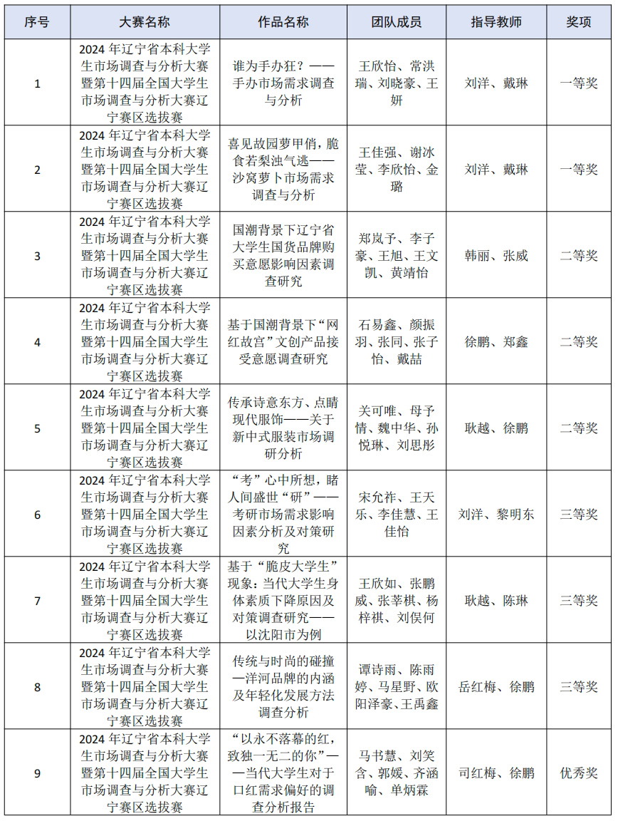 在2024年辽宁省本科大学生市场调查与分析大赛暨第十四届全国大学生市场调查与分析大赛辽宁赛区选拔赛中,获得一等奖2项、二等奖3项、三等奖3项、优秀奖3项。