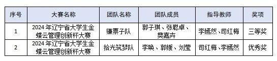 在2024年辽宁省大学生金蝶云管理创新杯大赛中,获得省级三等奖1项、优秀奖1项。