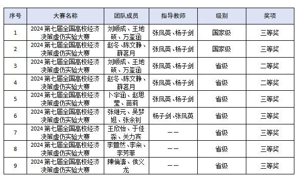 在2024第七届全国高校经济决策虚仿实验大赛中,获得国家级三等奖2项;省级二等奖2项、三等奖5项。