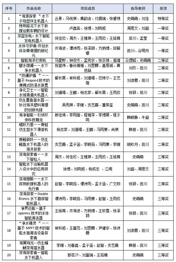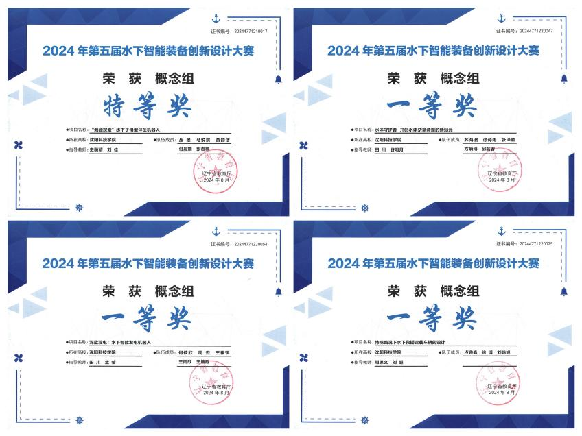 在2024年第五届水下智能装备创新设计大赛中,获得省级特等奖1项、一等奖3项、二等奖8项、三等奖8项、优秀奖9项。