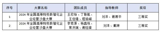 在2024年全国高等院校数智化企业经营沙盘大赛中,获得省级三等奖2项。