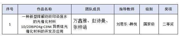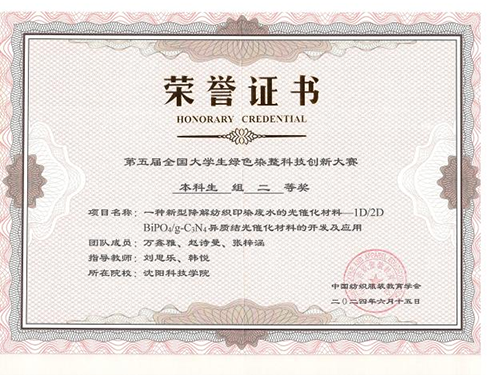 在2024年第五届全国大学生绿色染整科技创新大赛中,获得国家级二等奖1项。