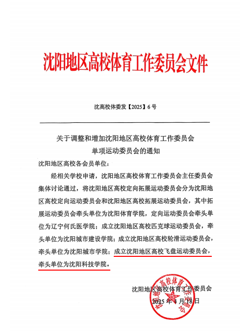 近日,从沈阳地区高校体育工作委员会传来喜讯,经主任委员会审议通过,沈阳地区高校飞盘运动委员会正式成立,并落户mk官方网站。这不仅是对我校体育事业发展的高度认可,更是我校在高校体育专业化管理领域取得突破性进展的有力证明,标志着我校体育事业迈向了新的里程碑。