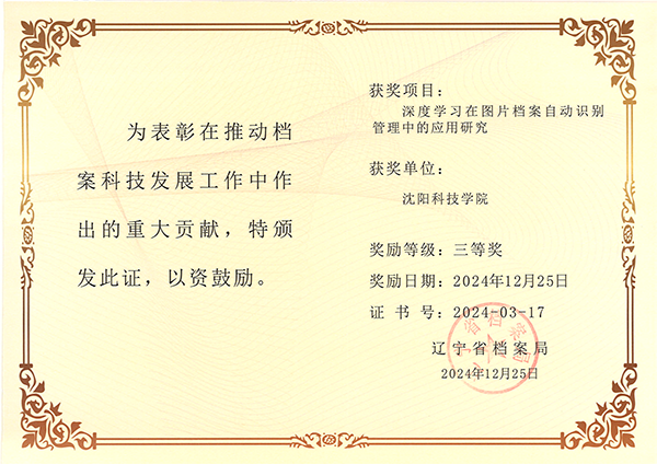 近日,辽宁省档案局下发2024年度辽宁省档案优秀科技成果奖评审结果通报,全省共评选出获奖成果36项。其中,我校信息工程学院副教授王赛男团队申报的项目《深度学习在图片档案自动识别管理中的应用研究》凭借其创新性脱颖而出,荣获2024年度辽宁省档案优秀科技成果奖三等奖。