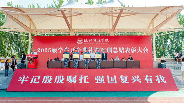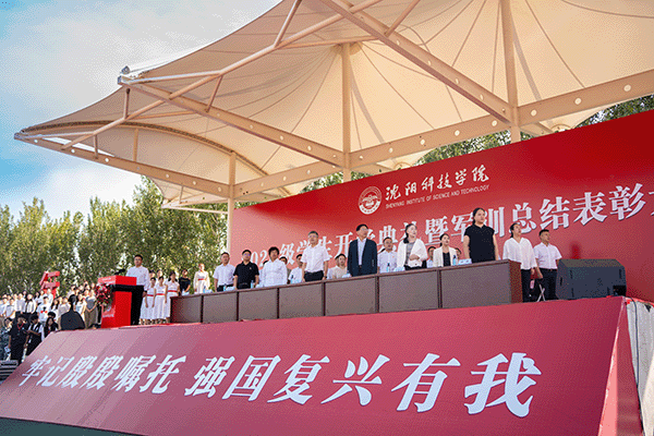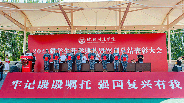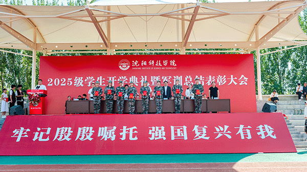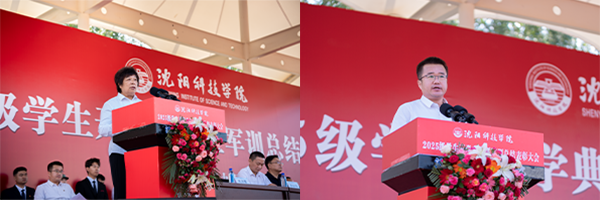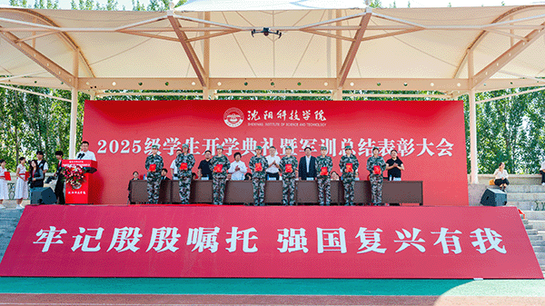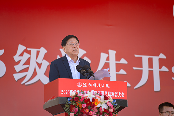 校长宋吉鑫作了题为《逐梦沈科 共赴未来》的讲话。他指出,在纪念中国人民抗日战争暨世界反法西斯战争胜利80周年阅兵活动的激励和鞭策下,同学们圆满完成了军训任务,经历了大学生活的第一课,晒黑了皮肤,强健了体魄,磨炼了意志。在此,他向全体新生提出三点希望,与之共勉:一是志存高远,树立远大理想。理想是灯塔与引擎,周恩来总理、袁隆平院士因有理想而成就非凡。大家要结合自身特长树立理想,不懈奋斗成就无悔人生。二是博学笃行,做到学思践悟。遵循校训,广泛涉猎知识,拓宽视野,培养综合素养。学会思考,提高思维与创新能力,将知识转化为能力,让读书成为生活一部分。三是种德修身,培养良好品德。以“德才兼备、知行合一”规范言行,诚实守信、尊老爱幼、团结友爱,积极参加社会实践,培养社会责任感,从身边小事做起,做受社会欢迎之人。四是勇毅前行,做生活的强者。勇于有梦、善于圆梦,利用好大学时光,坚持学习,构建知识能力体系,用其认识和改造世界。