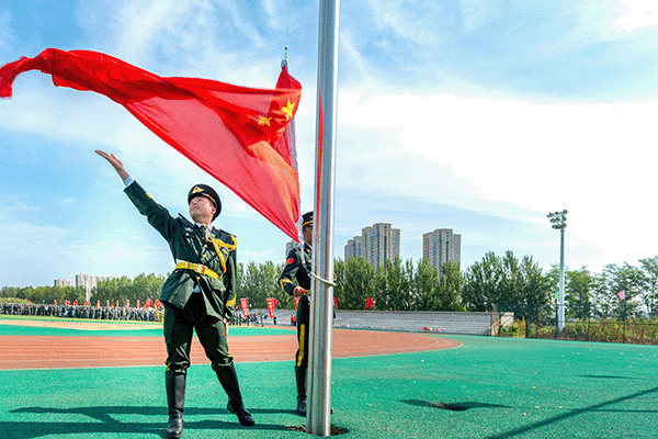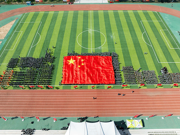 随着《歌唱祖国》的音乐响起,一面由近千人共同托举的巨幅国旗,向主席台走来,红旗猎猎,似燃烧的火焰划破长空,那跃动的红是赤子之心,承载着对祖国的深情,激荡起每个人心中的家国豪情!