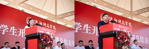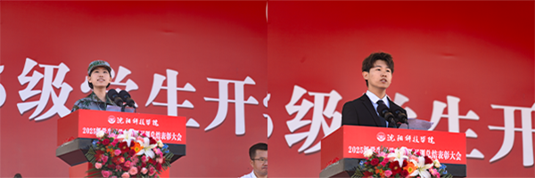 信息工程学院物联网工程2502班李雪畅作为新生代表发言,她以铿锵誓言表达了对大学生活的憧憬与奋发图强的决心。机械工程学院智能制造工程专业2402班董帅同学代表全体在校生发言,勉励学弟学妹传承沈科精神,勇攀学术高峰。