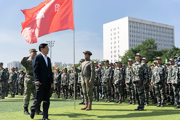 党委书记、军训团政委耿乃国宣布军训汇报展演开始。校长、军训团团长宋吉鑫依次检阅各营方队。