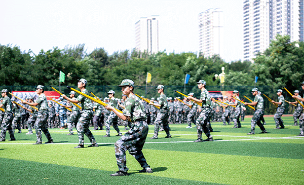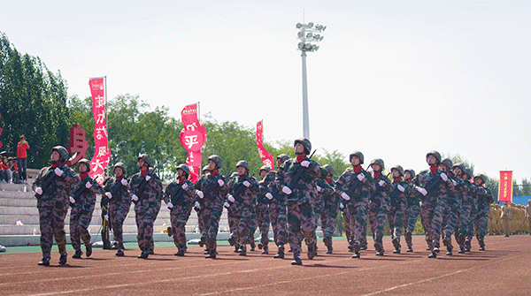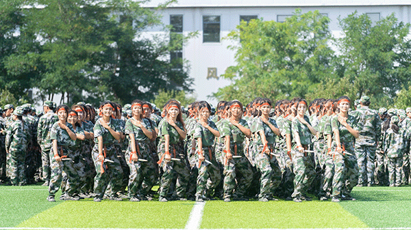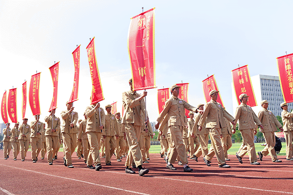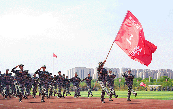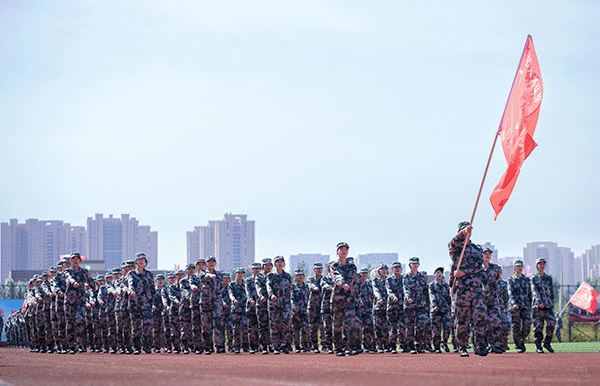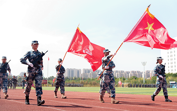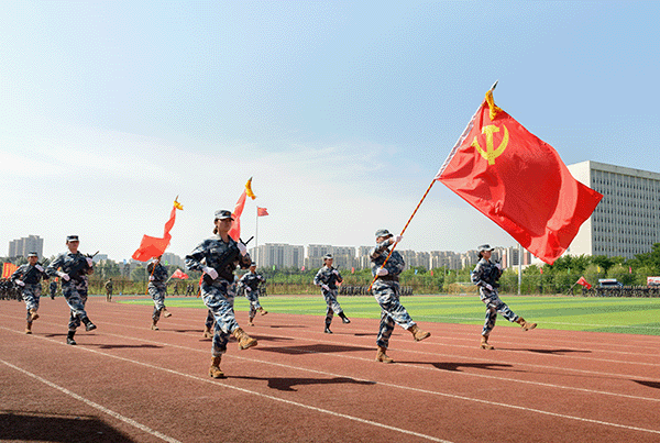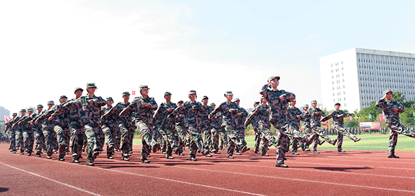 由党旗、国旗、校旗方队领衔,各营连方队依次接受检阅。女子持枪方队英姿飒爽,战旗方队气势如虹,各营连以整齐划一的步伐、铿锵有力的口号展现军训成果。